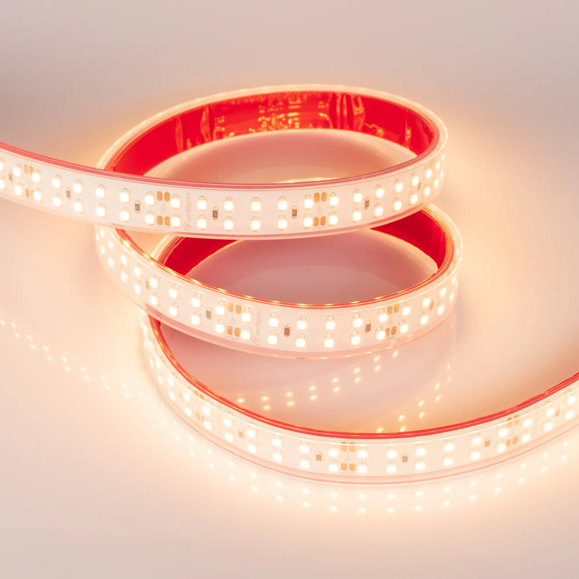 Широкая герметичная IP66 (плата в cиликон.трубке) гибкая лента LUX, светодиоды 2x2 (2 ряда) smd 3528, 240шт/м (1200шт на 5м), белая плата 15мм, скотч 3М. Цвет БЕЛЫЙ ТЕПЛЫЙ 2600-2800K.Питание 24В, мощность 19,2 Вт/м (96 Вт на 5м), угол 120°. Размеры 5000x17.5x5.5мм. Мин.отрезок 50мм (12 LED). Цена за 1м.