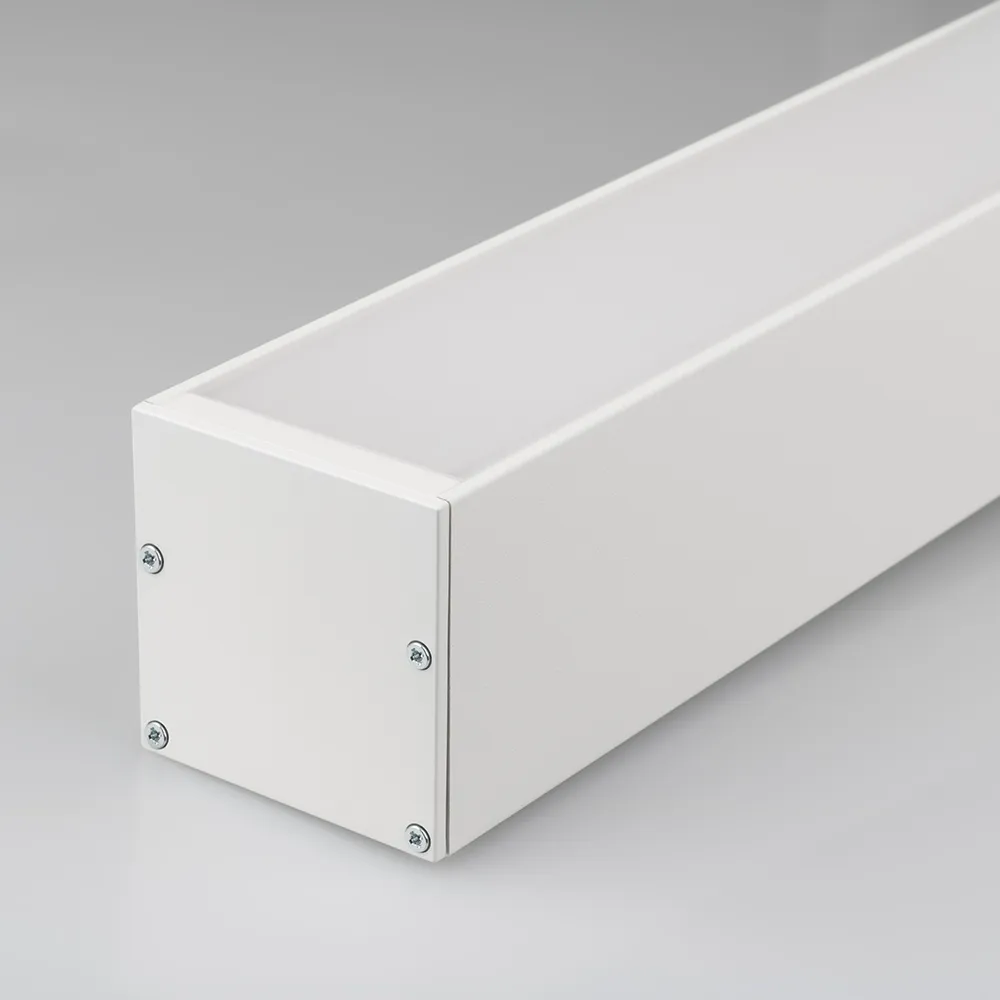 Комплект с экраном. Алюминиевый профиль для светодиодных лент и линеек. Цвет - белый RAL9003 (порошковая окраска). Габаритные размеры (L×W×H): 2500x50x50 мм. Ширина площадки для ленты 38 мм. Отсек для БП 46х22мм.