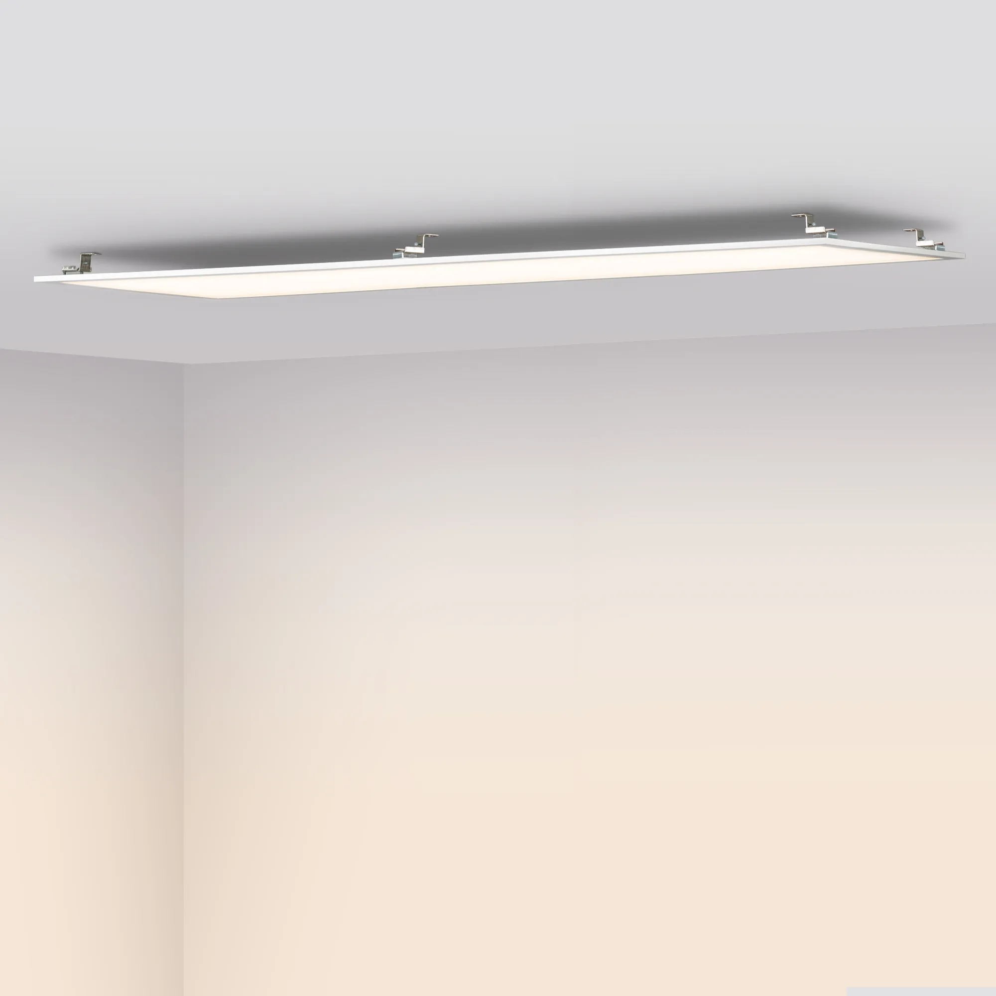 Светодиодная панель с торцевой заcветкой. Мощность 40 Вт, св. поток 3600 лм, 90 лм/Вт, теплый 3000 K, CRI>80, угол 120°, напряжение питания 230 В. Белый квадратный корпус из алюминия, экран PS, LGP PS, степень защиты IP40. Размер (Д×Ш×В) 1195×295×10,4 мм. Монтаж встраиваемый, установочное отверстие длина 1175 мм, ширина 275 мм. Драйвер 34.5-57.5 В, 700 мА, пульсация <5%.