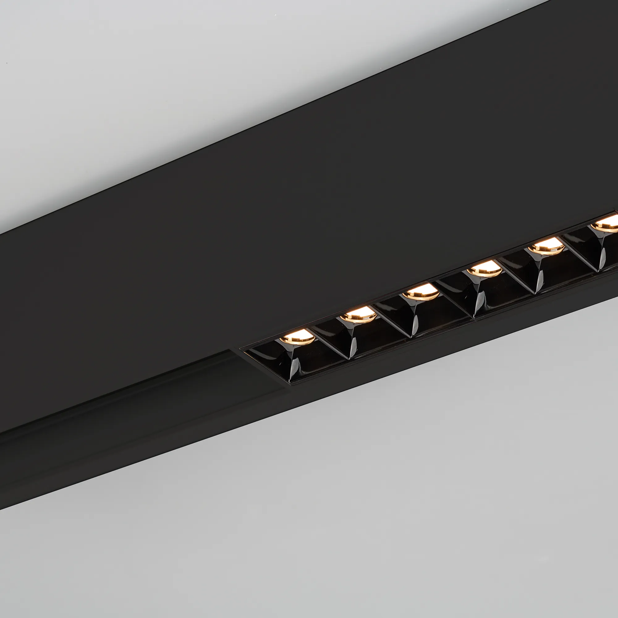 Светильник для магнитных треков шириной 45мм, 12Вт. Цвет свечения ДНЕВНОЙ 4000K, световой поток 890лм, угол 15°, CRI>90. Корпус прямоугольный, металл, цвет черный, IP20. Размеры LxWxH 322x35x43мм. Входное напряжение DC24V, мощность 12Вт. Драйвер DС24V/AC230V поставляется отдельно. Диммируется только с 026407(1), 027633.