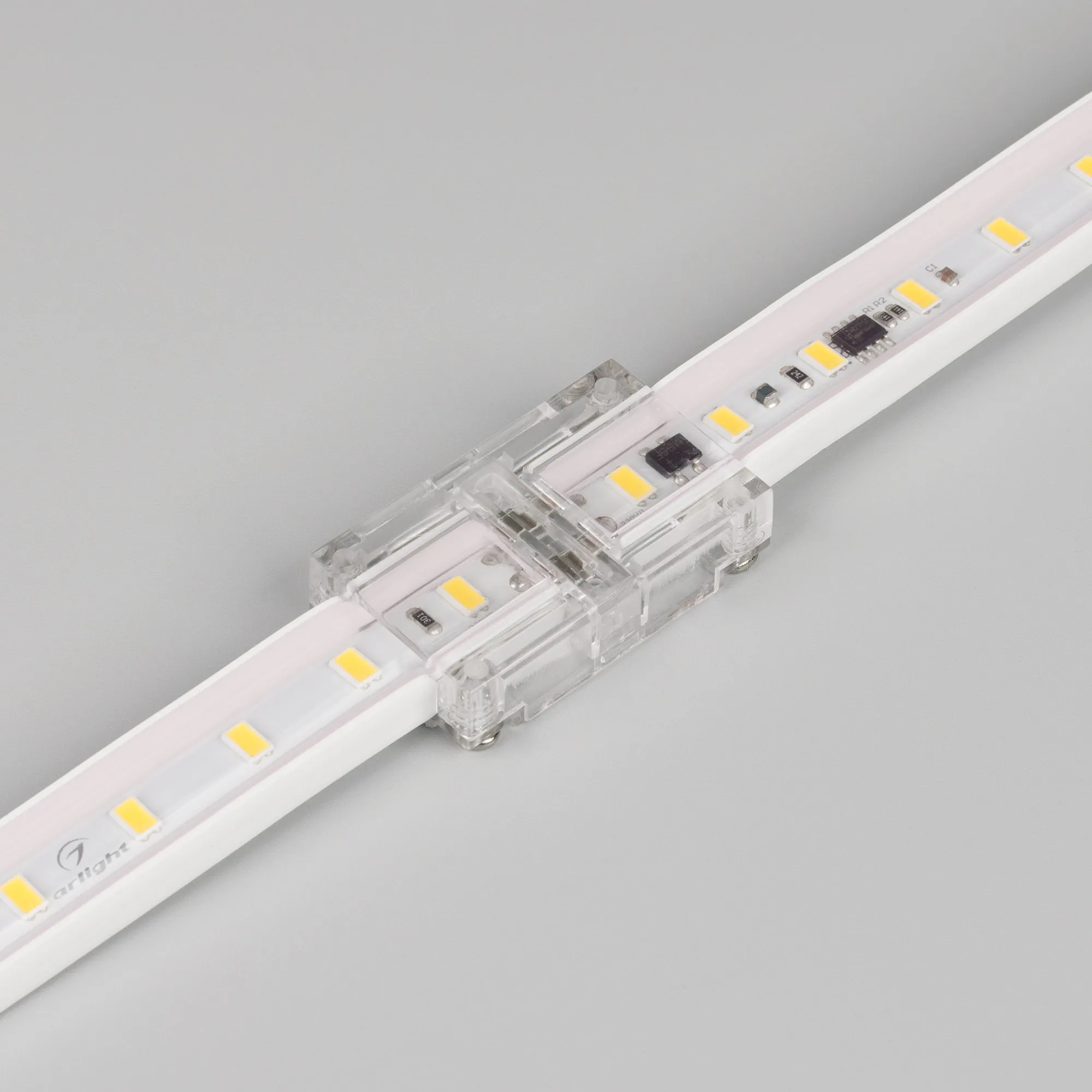 Коннектор прямой для соединения 2-х отрезков ленты ARL-50000PV (15.5x6mm, тип WP2). Питание 230V. Материал - прозрачный пластик PC.