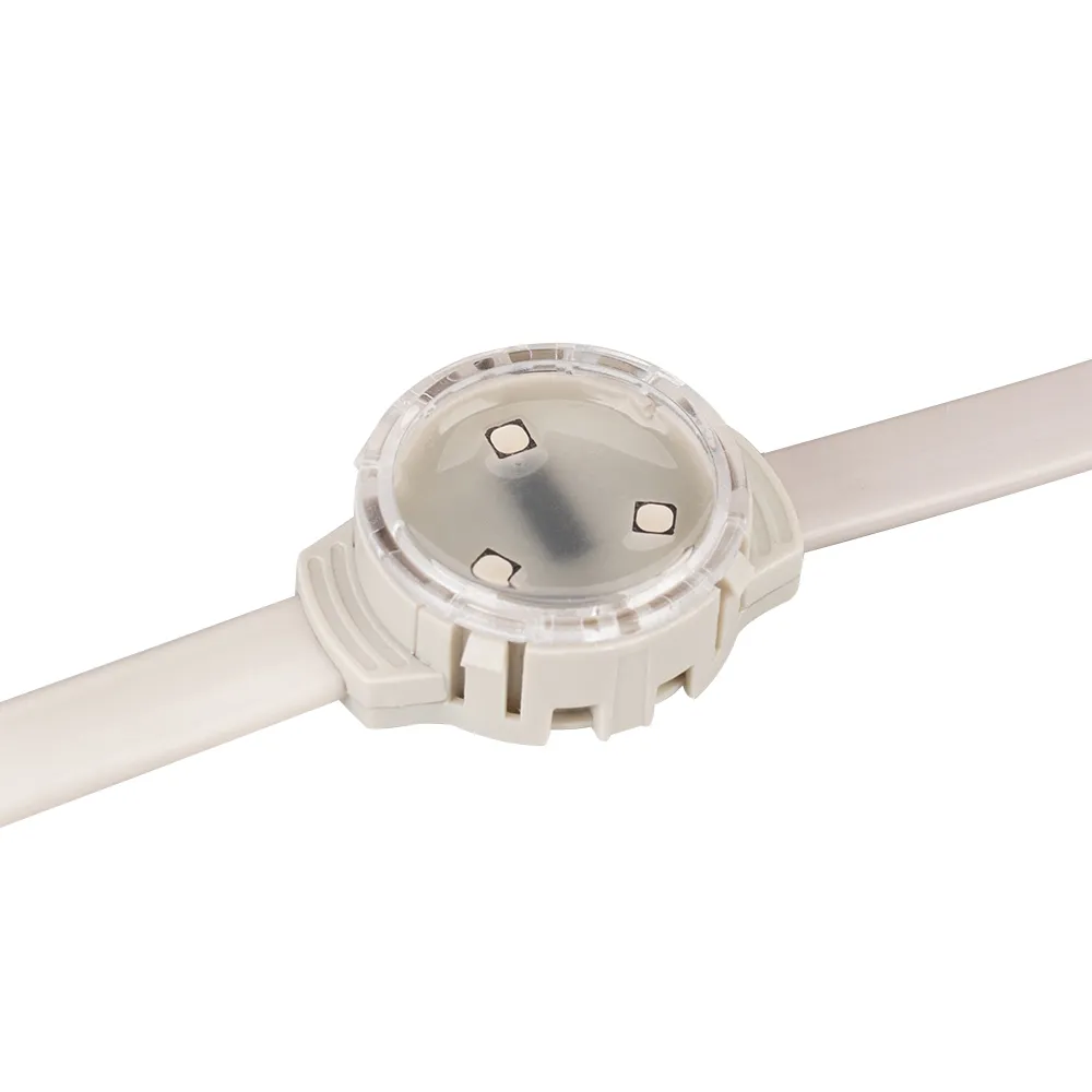 Управляемый светодиодный модуль DMX, RGB, микросхема UCS512С4, напряжение 12 В, мощность 0.75 Вт, 3 светодиода SMD 3535, угол 120°. Создание медиафасадов. 20 или 30 шт на проводе, расстояние между центрами модулей 105 мм, длина провода между модулями 70 мм. IP67. Размер Ø29.5×16 мм. Гарантия 3 года.
