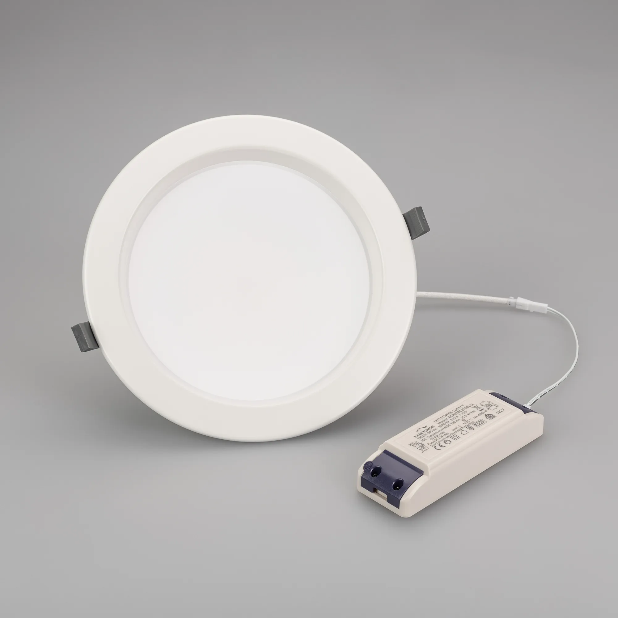 Встраиваемый светильник "Даунлайт" 30Вт. Цвет свечения ТЕПЛЫЙ БЕЛЫЙ 3000К. Световой поток 2610лм, угол 90°, CRI>80. Белый корпус. Питание AC220-240V. Габариты: Ø230х75мм, врезное отверстие Ø192-210мм. Драйвер в комплекте (25-43V, 700mA).