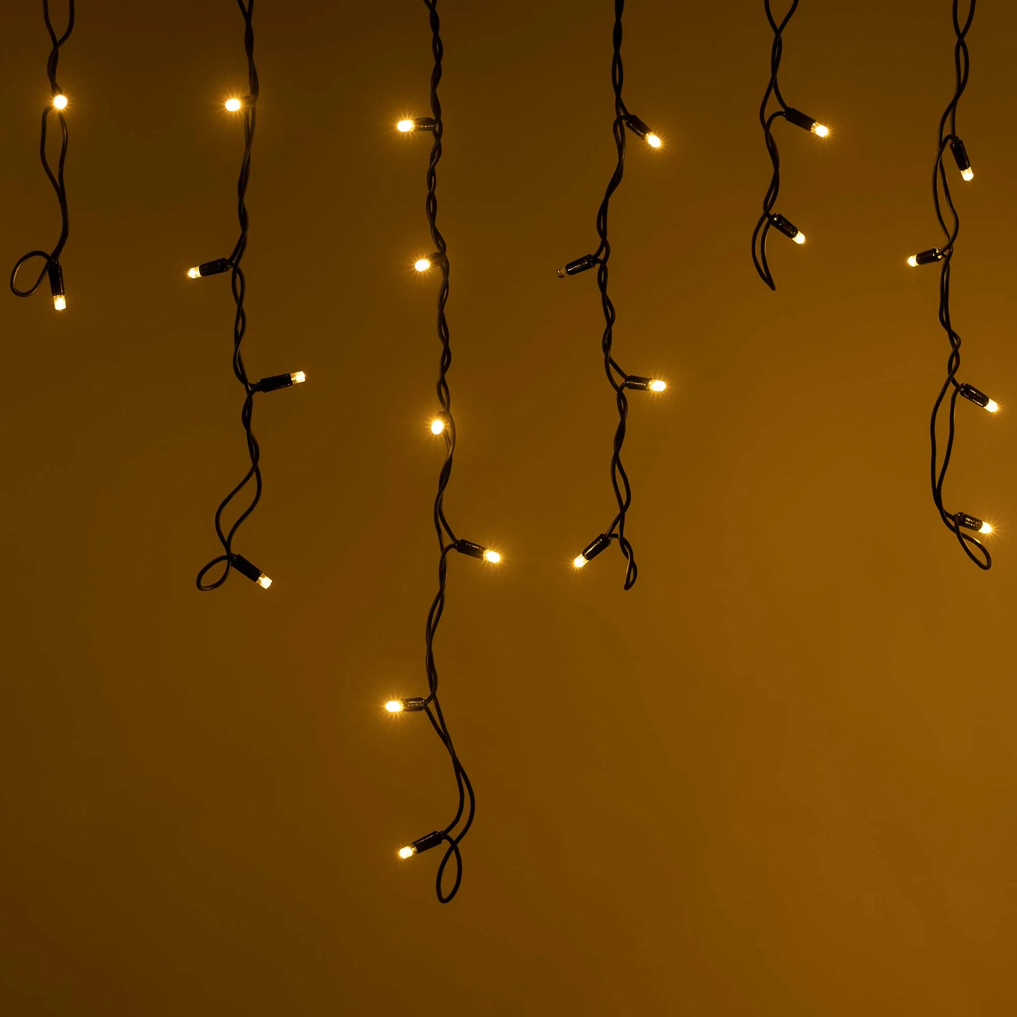 Светодиодная бахрома Pro. Размер 4000 мм (длина 4000 мм, по длине 32 нити высотой 200/600 мм). Количество светодиодов 128 шт размером 7 мм. Основной цвет свечения ТЕПЛЫЙ БЕЛЫЙ (3000 К), эффект мерцания редких точек ТЕПЛЫЙ БЕЛЫЙ (3000К) с резким световым рисунком (прозрачная вогнутая линза), соотношение светодиодов: 106 теплых постоянного свечения / 22 белых с мерцанием. Эффект частого мерцания. Провод черный, каучук. Питание 230 В, Мощность 6 Вт, защита IP65, применение на улице под навесом. Аксессуары для подключения приобретаются отдельно.