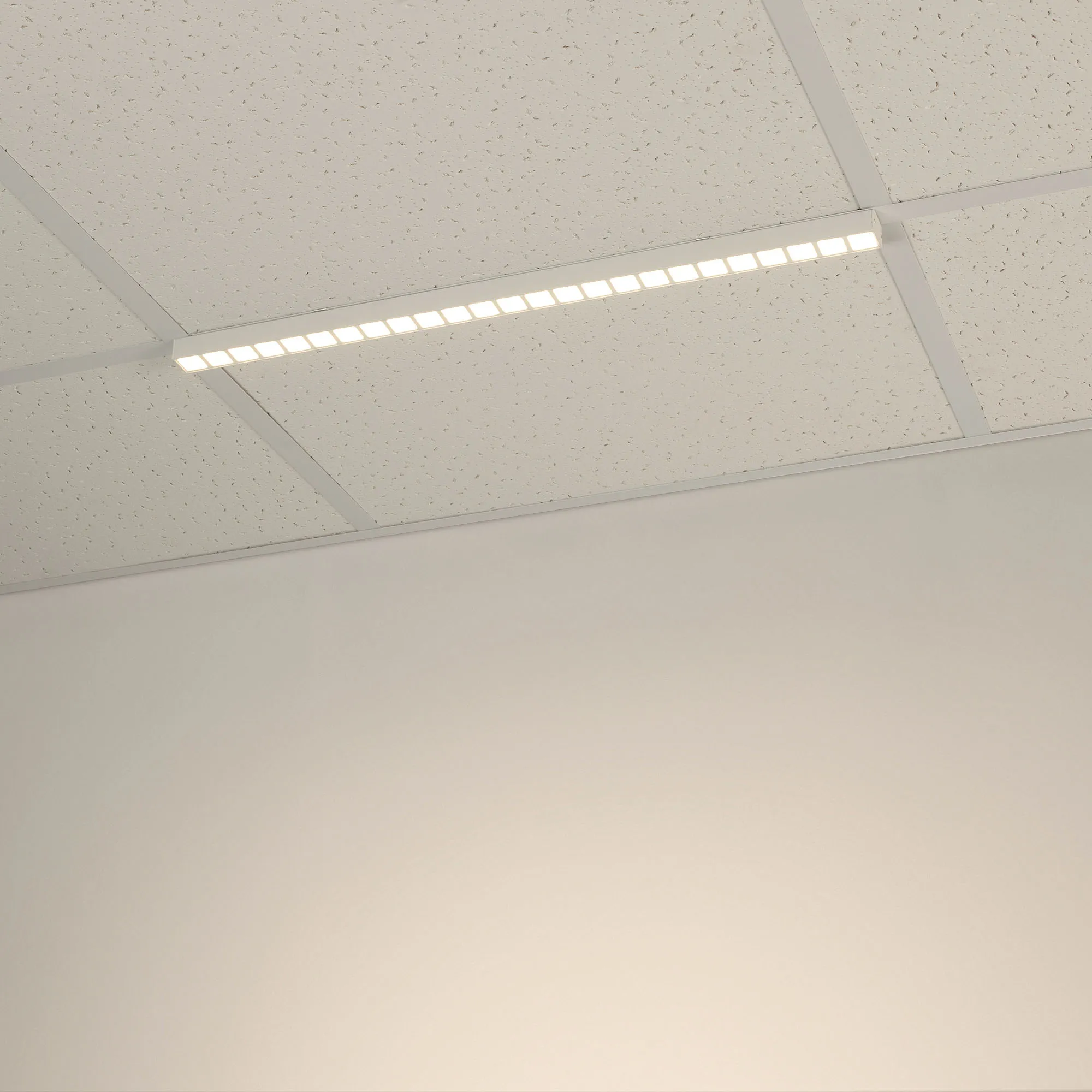 Светодиодный светильник для направляющих потолка Армстронг шириной 15 и 24 мм. Мощность 28 Вт, св. поток 2660 лм, 97 лм/Вт, теплый 3000K, CRI>80, угол 80°, напряжение питания 48 В. Белый квадратный корпус из алюминия, экран PC, степень защиты IP40. Размер: длина 1200 мм, ширина 25 мм, высота 28 мм. Монтаж накладной. Драйвер поставляется отдельно.