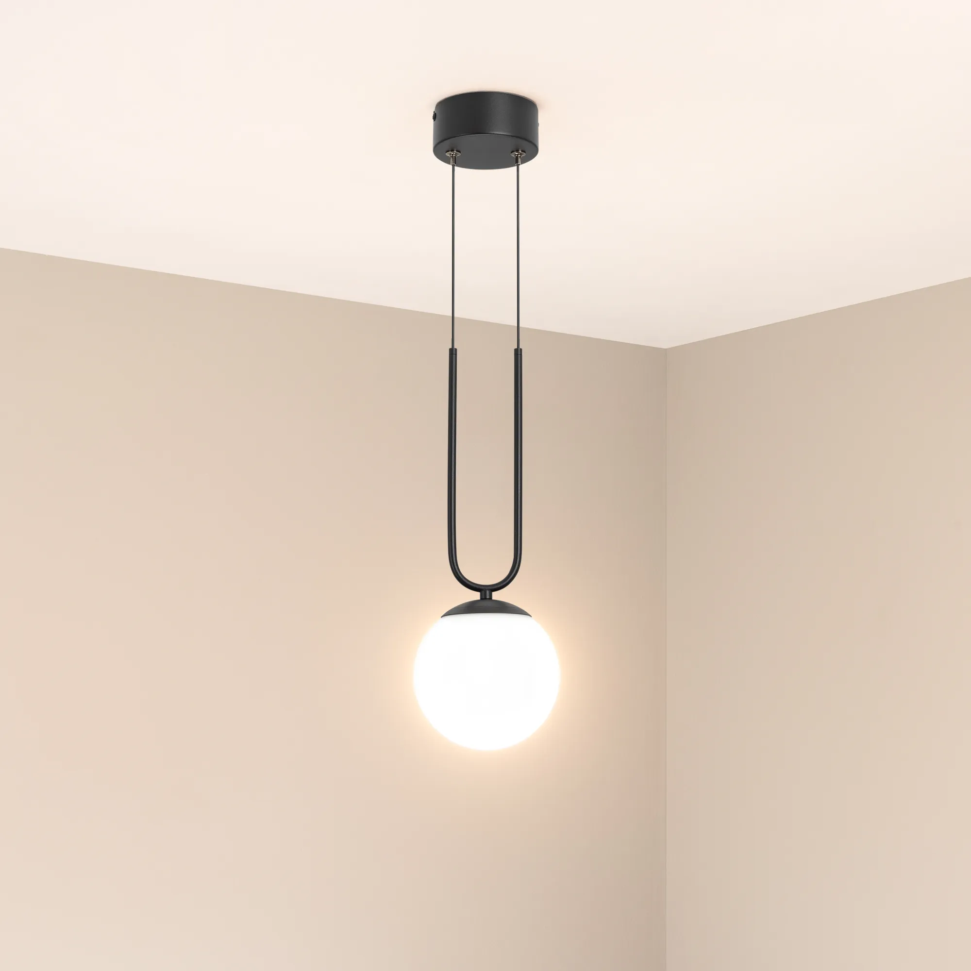 Подвесной светильник. Мощность 10 Вт, св. поток 710 лм, 71 лм/Вт, теплый 3000 K, CRI>90, угол 275°, напряжение питания 230 В. Черный круглый корпус из алюминия и стали, рассеиватель стекло, степень защиты IP20. Размер: диаметр 130 мм, высота ножки 220 мм, высота с плафоном 357 мм, размер чаши: диаметр 100 мм, высота 40 мм. Монтаж подвесной, длина подвеса 1140 мм. Драйвер 6-14 В, 600 мА, пульсация <1%.