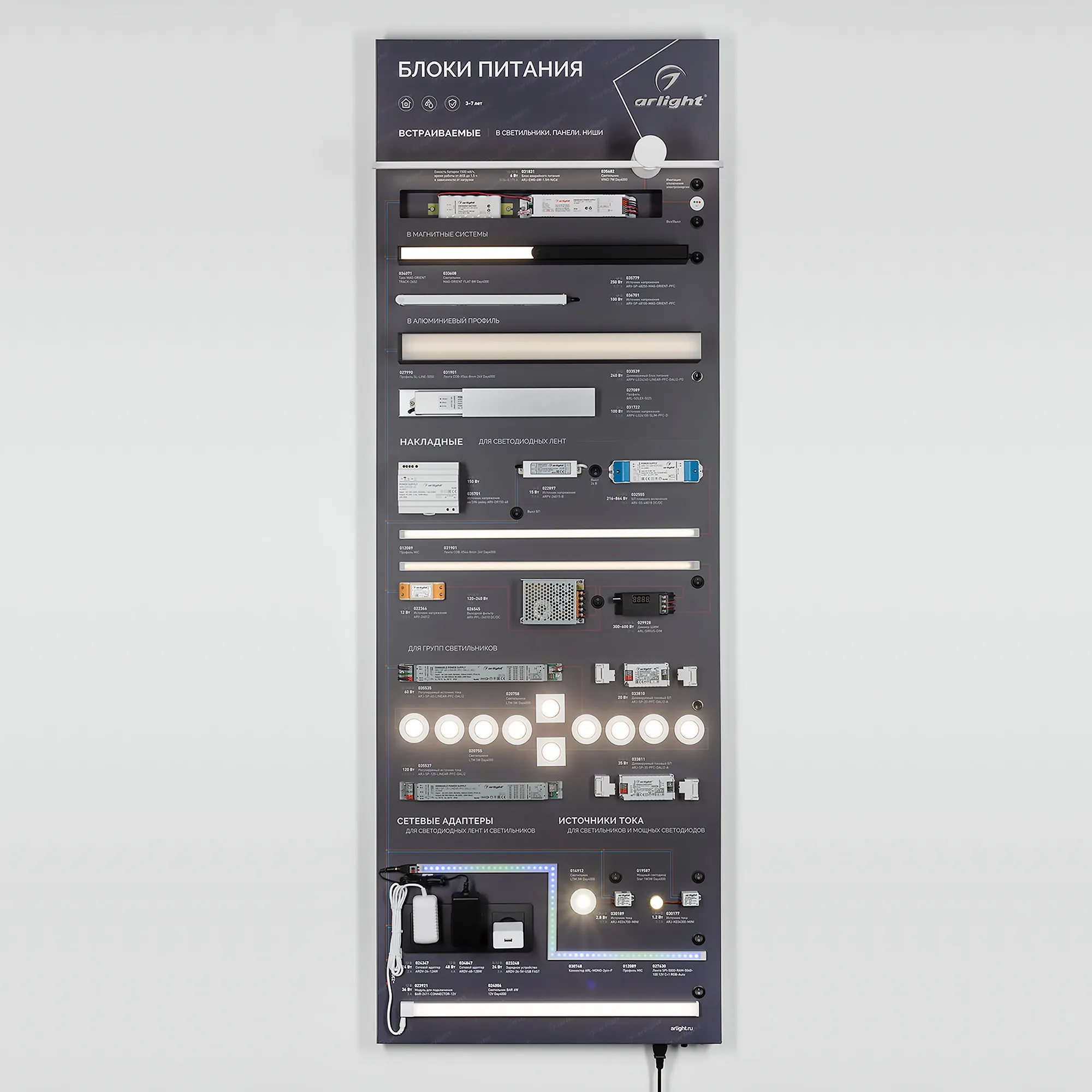 Наши специалисты знают все о продукции Arlight и с радостью помогут Вам выбрать комплектующие к товару "Стенд Блоки Питания ARP-E15-1760x600mm (DB 3мм, пленка) (Arlight, -)", или другие товары из раздела "Блоки питания".