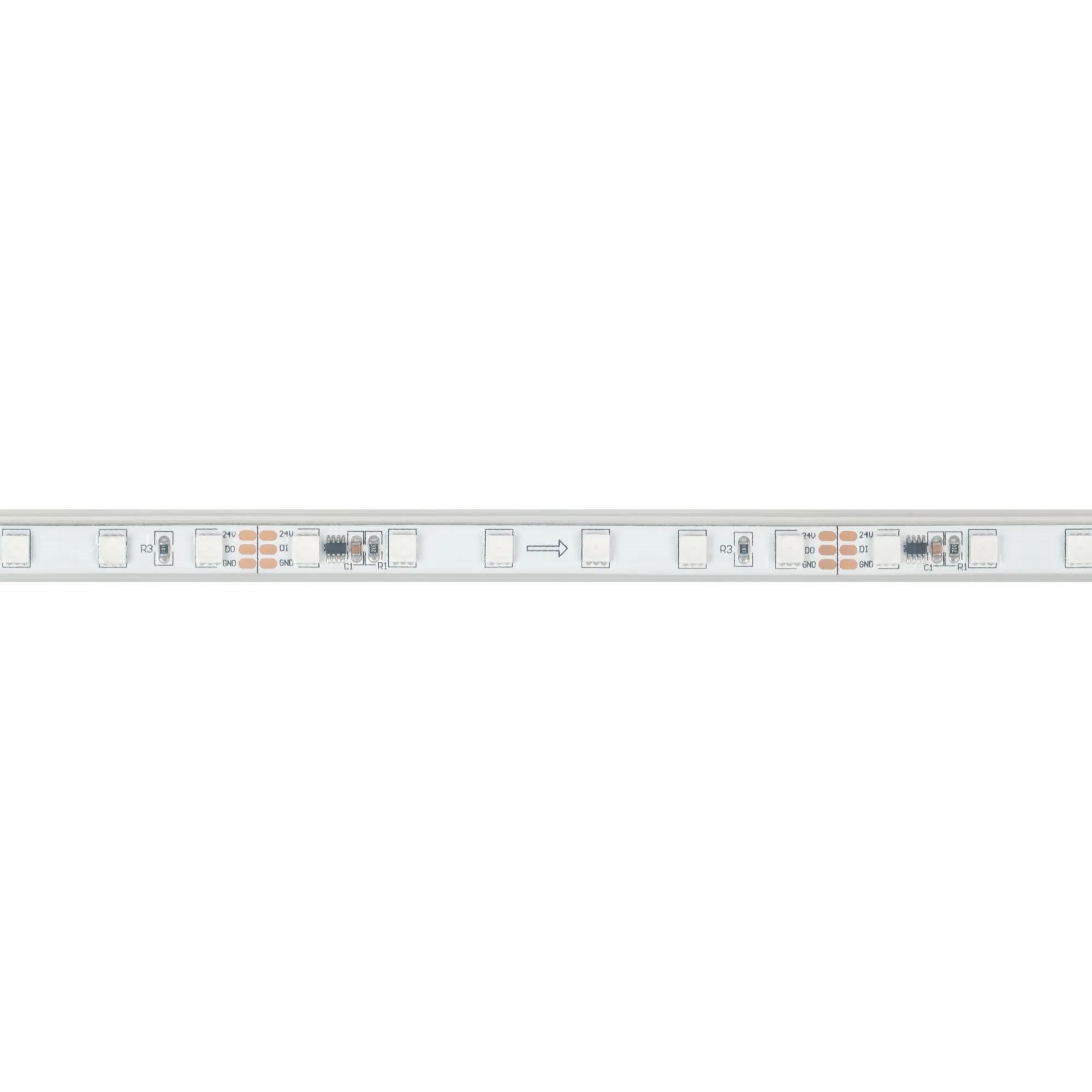 Светодиодная герметичная лента SPI серии F72 с микросхемой 16703(MT1803), IP66 (P - силиконовая трубка). Светодиоды SMD 3535, 72 шт/м, 12 pixels на 1 м (60 pixels на 5 м), 1 pixel = 6 светодиодов, белая плата шириной 7 мм, скотч 3М. Цвет RGB, угол 120°. Питание 24 В, мощность 14.4 Вт/м (72 Вт на 5 м). Размеры 5000x11x4 мм. Мин. отрезок 83.3 мм, 6 светодиодов. Цена за 1 м.
