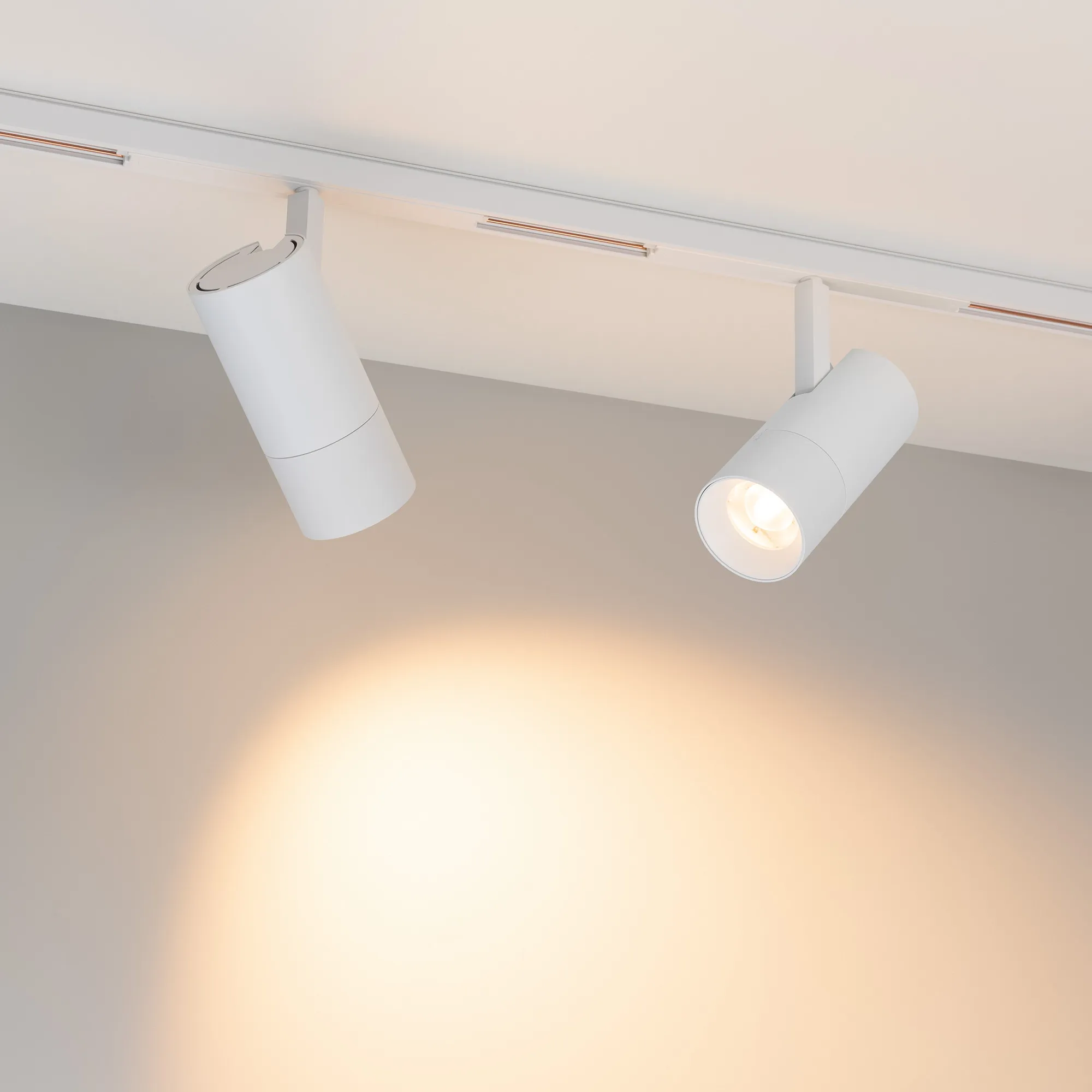 Светильник для магнитных треков MAG-ORIENT шириной 26 мм. Мощность 15 Вт, св. поток 1100 лм, 85 лм/Вт, теплый 3000 K, CRI>90, угол 34-60°, напряжение питания 48 В. Белый фигурный корпус из металл, экран поликарбонат, степень защиты IP20. Размеры LxWxH 204×66×211 мм.