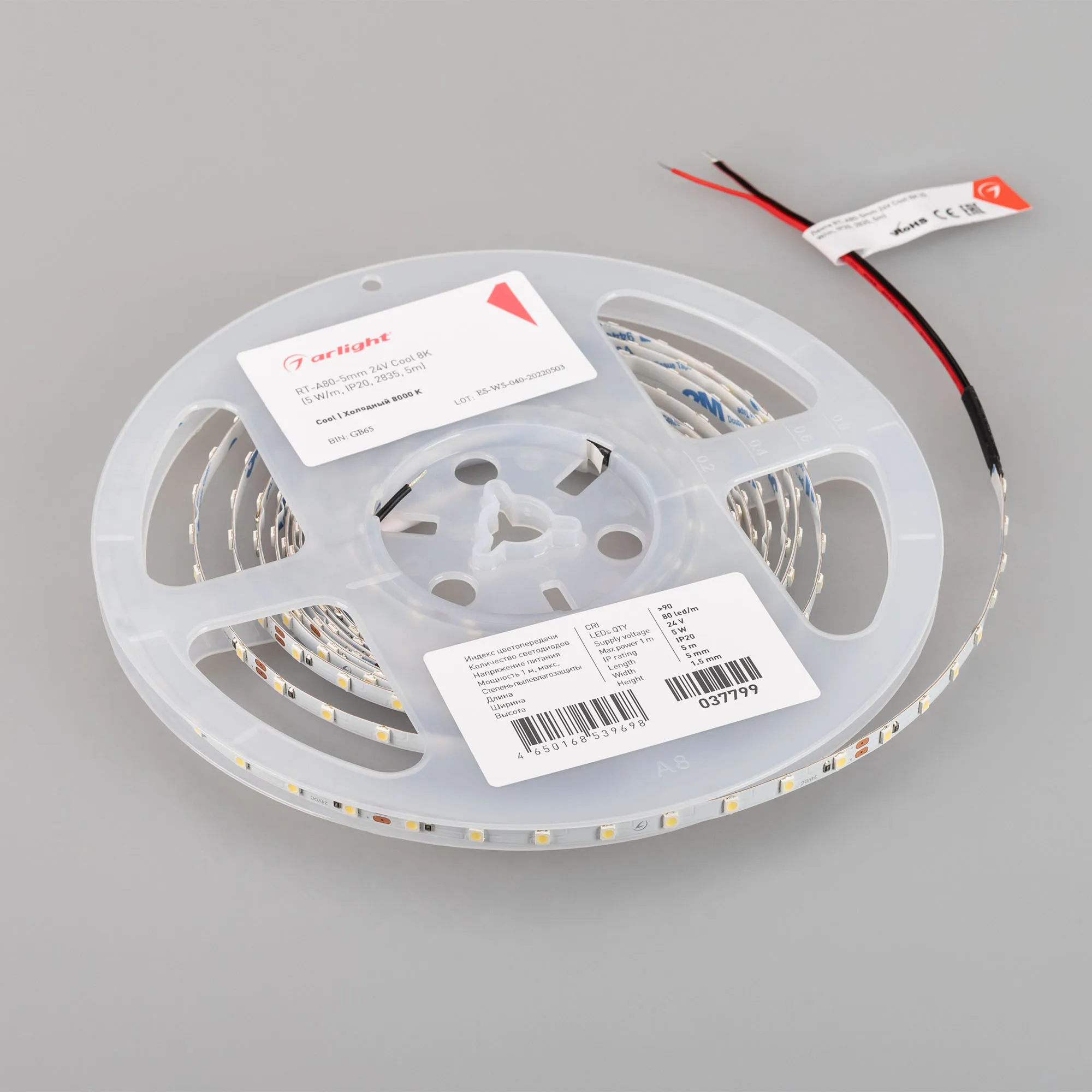 Лента светодиодная RT-A80-5mm 24V Cool 8K (5 W/m, IP20, 2835, 5m) (Arlight, Открытый)