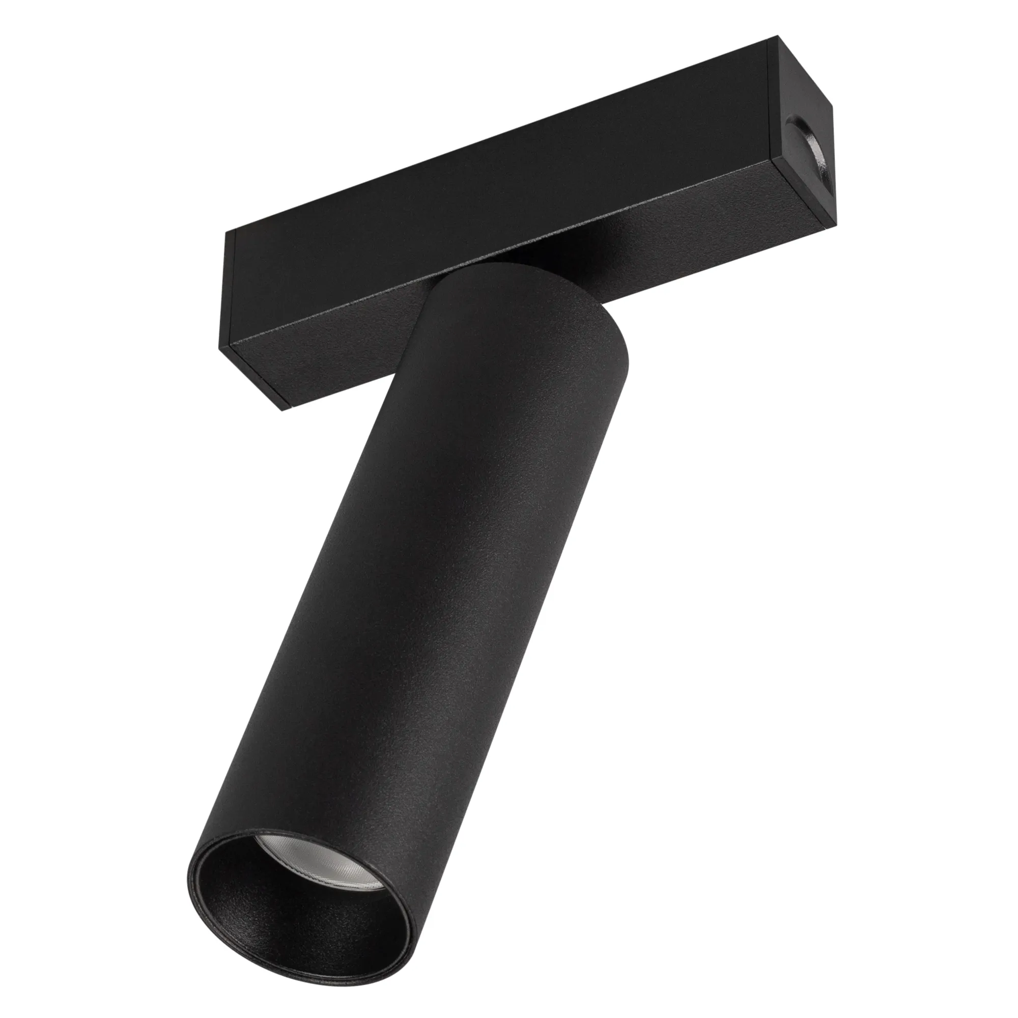 Светильник поворотный для магнитных треков шириной 25 мм, 12 Вт. Цвет свечения ТЕПЛЫЙ 3000K, световой поток 840лм, угол 30°, CRI>90. Корпус прямоугольный, металл, цвет черный, IP20. Размеры LxWxH 100x20x150 мм. Входное напряжение DC24V, мощность 12 Вт. Драйвер AC230V/DC24V поставляется отдельно. Диаметр светоизлучающего модуля 35 мм.