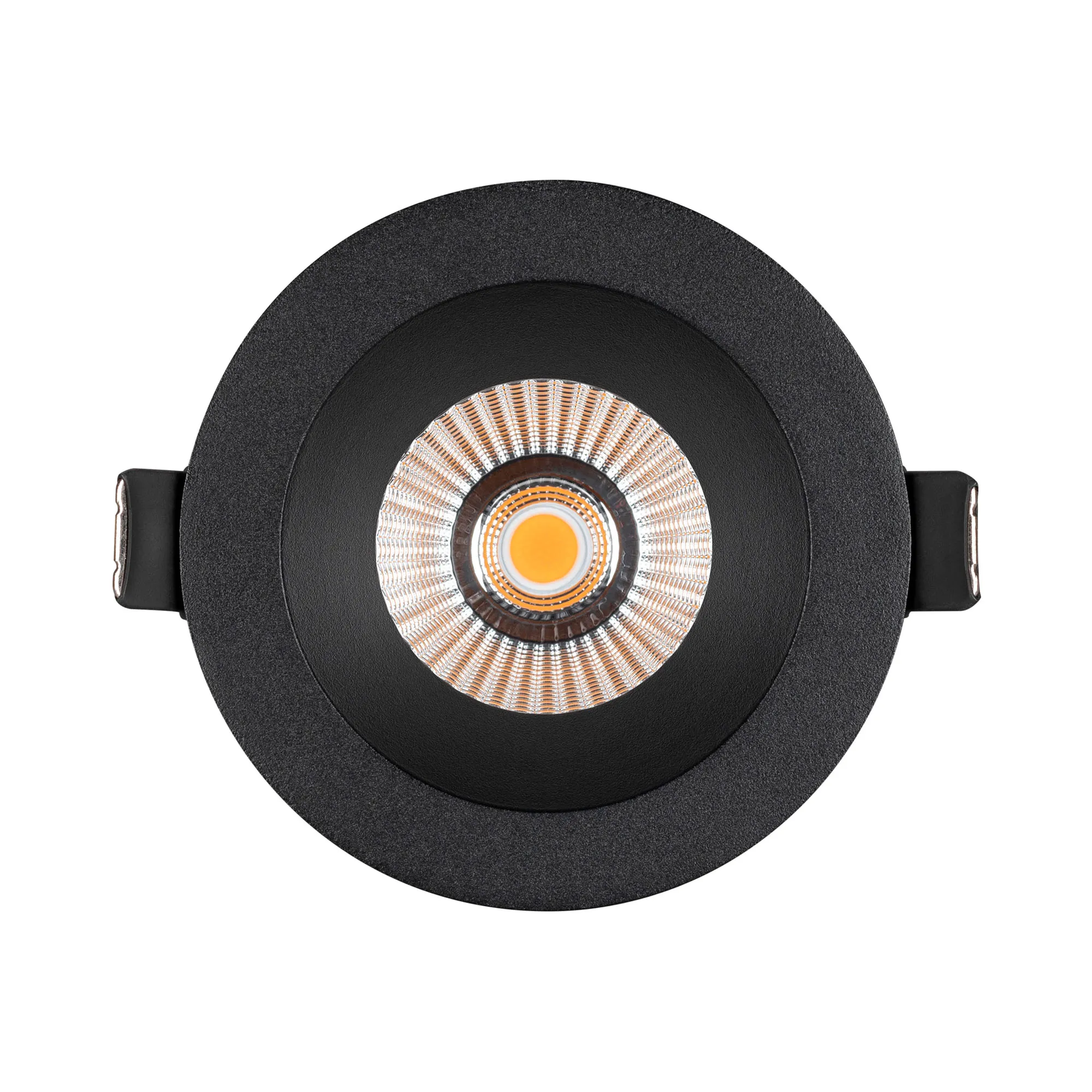 Встраиваемый светильник даунлайт. Мощность 10 Вт, св. поток 750 лм, 75 лм/Вт, тёплый 3000 K, CRI>90, угол 36°, напряжение питания 230 В. Чёрный круглый корпус из алюминия, экран PMMA, степень защиты IP54. Размер: диаметр 86 мм, высота 80 мм. Монтаж встраиваемый, установочное отверстие: диаметр 80 мм. Драйвер IP54, 20-40 В, 250 мА, пульсация <1%.