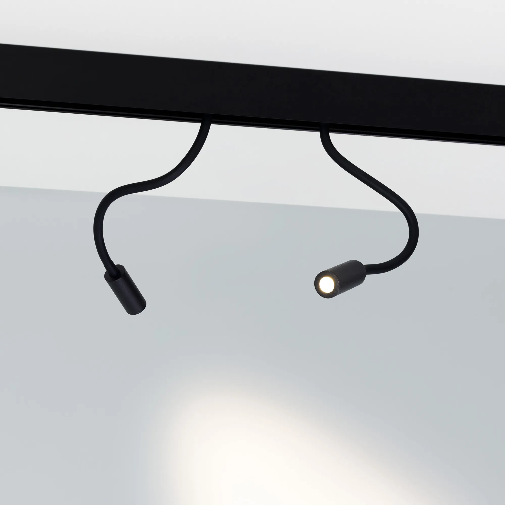 Светильник для магнитных треков MAG-ORIENT  с  цветовой температурой 3000K. Мощность 3 Вт, св. поток 140 лм, 47лм/Вт, CRI>80, угол 24°, напряжение питания 48 В. Черный фигурный корпус из металл, экран поликарбонат, степень защиты IP20. Размеры LxWxH 363x25x126 мм. Габариты световой части Ø25x60мм. Монтаж на трек MAG-ORIENT. Пульсация <3%.