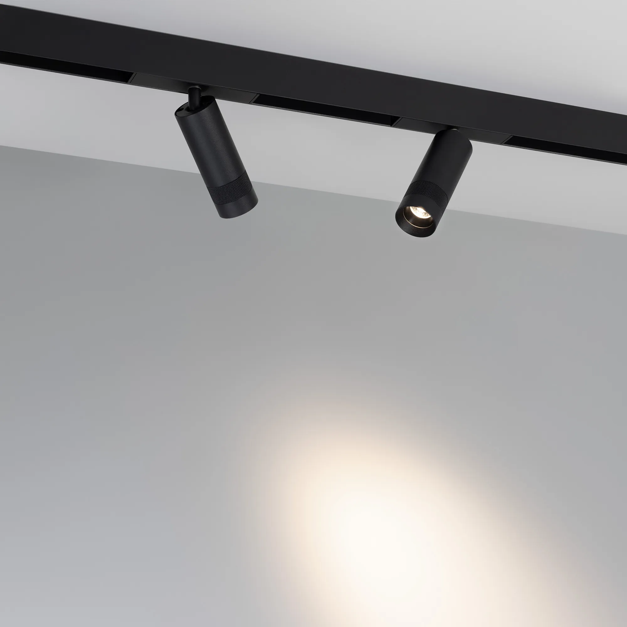 Светильник поворотный для магнитных треков шириной 25 мм, 7 Вт. Цвет свечения дневной 4000K, световой поток 410лм, изменяемый угол излучения 20-55°, CRI>90. Корпус цилиндрический, металл, цвет черный, IP20. Размеры LxWxH 128x35x105 мм. Входное напряжение DC24V, мощность 7 Вт. Драйвер DС24V/AC230V поставляется отдельно.