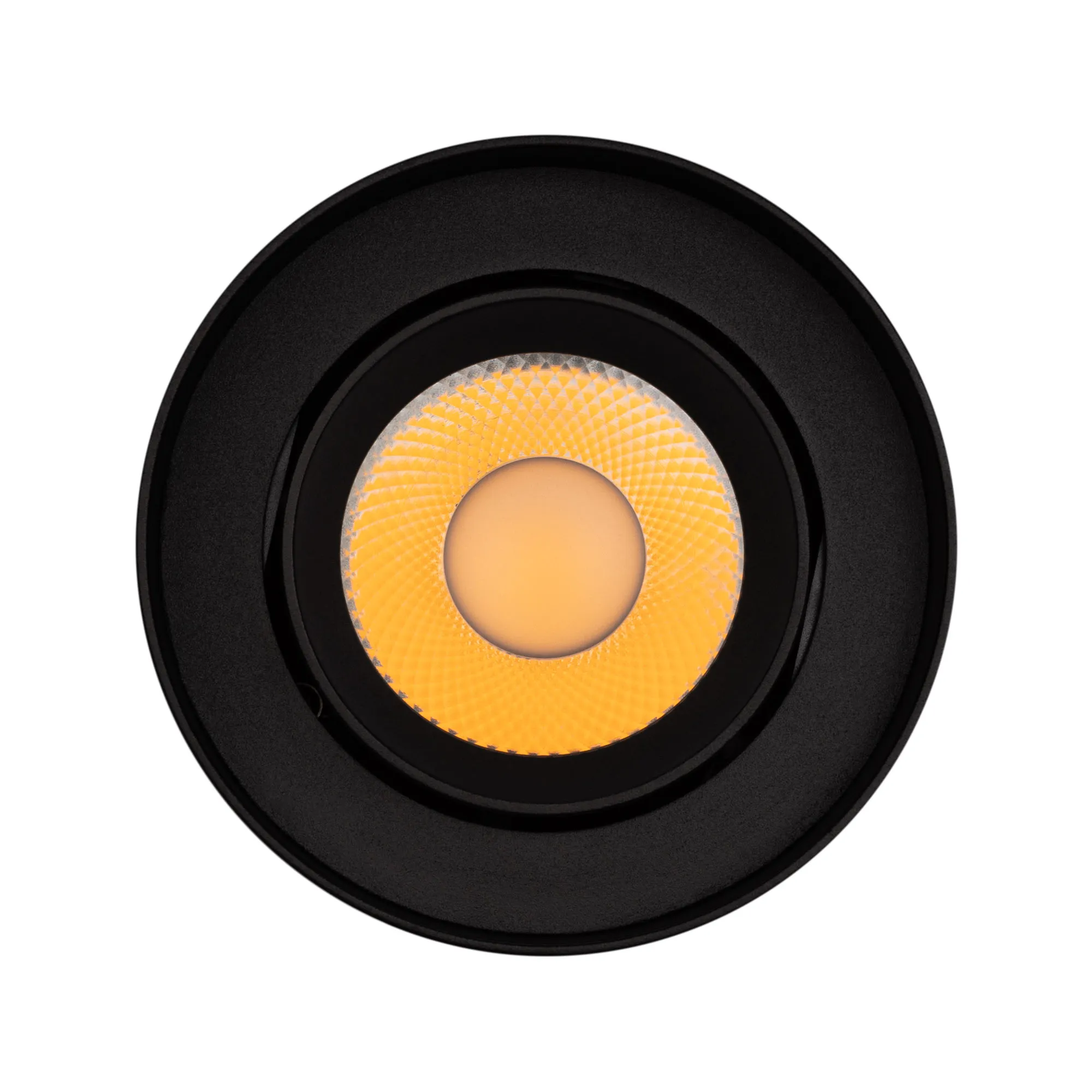 Накладной интерьерный светильник. Мощность 18 Вт, св. поток 1700 лм, 99 лм/Вт, теплый 3000 K, CRI>90, угол 15°, регулируемое направление луча 40°(20+20), поворотный световой модуль вокруг своей оси на 340°, UGR <11, напряжение питания 230 В. Чёрный круглый корпус из алюминия, степень защиты IP54. Размер: диаметр 110 мм, высота 145 мм. Монтаж накладной. Драйвер 27-43 В, 450 мА, пульсация <1%.