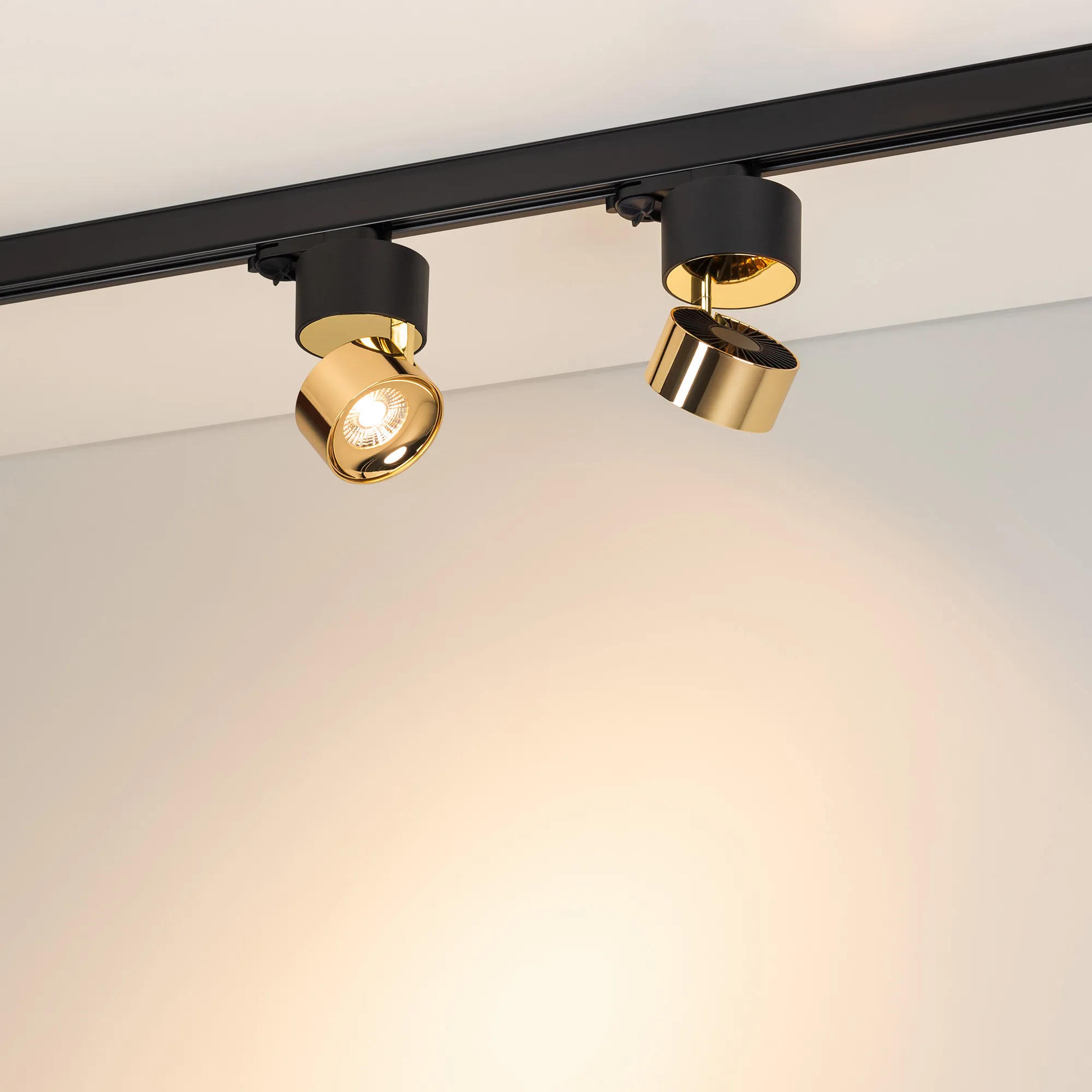 Светильник для треков/шин 4 провода. Мощность 9 Вт, св. поток 500 лм, 55 лм/Вт, теплый 3000 K, CRI>90, угол 36°, напряжение питания 230 В. Модуль цвета светлое золото, черный круглый корпус из алюминия, степень защиты IP20. Размеры корпуса: длина адаптера 86 мм, ширина 32 мм, высота 38,2 мм., высота основания 46 мм. Размер светодиодного модуля: диаметр 77 мм, высота 59 мм. Монтаж на трек 3-фазный. Драйвер 38 В, 200 мА, пульсация <1%.