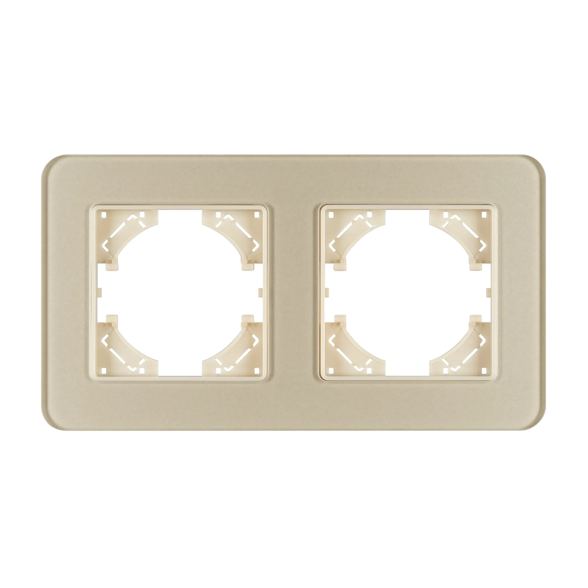 Рамка стеклянная на 2 поста, под встраиваемый механизм. Цвет - золотой с Soft-Touch покрытием. Среднего уровня герметичности IP20. Ориентация монтажа - горизонтальная (основным ориентиром служат посадочные выступы для накладки механизма).