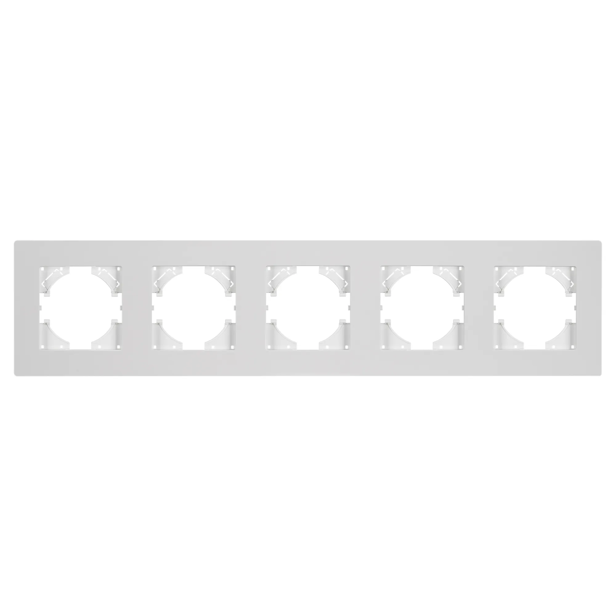 Рамка пластиковая на 5 постов, под встраиваемый механизм. Цвет - белый. Среднего уровня герметичности IP20. Ориентация монтажа - горизонтальная (основным ориентиром служат посадочные выступы для накладки механизма).