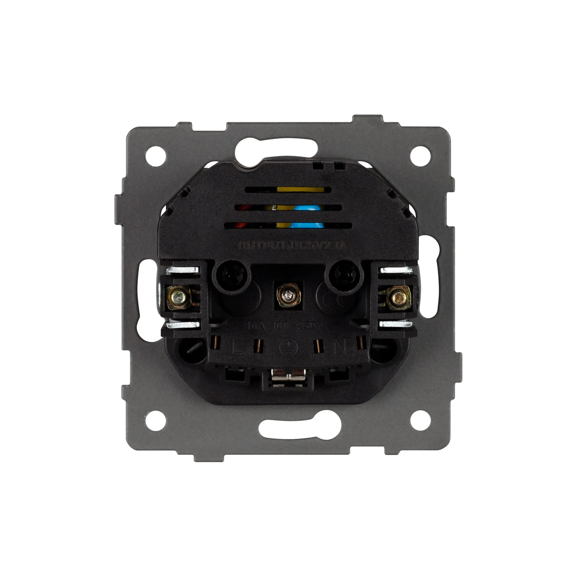 Механизм розетки с заземлением 1 пост 2 USB Type A+C порта. Цвет - черный. Без фронтальной рамки. Уровень пылевлагозащиты IP20. Устанавливается в стандартный подрозетник.