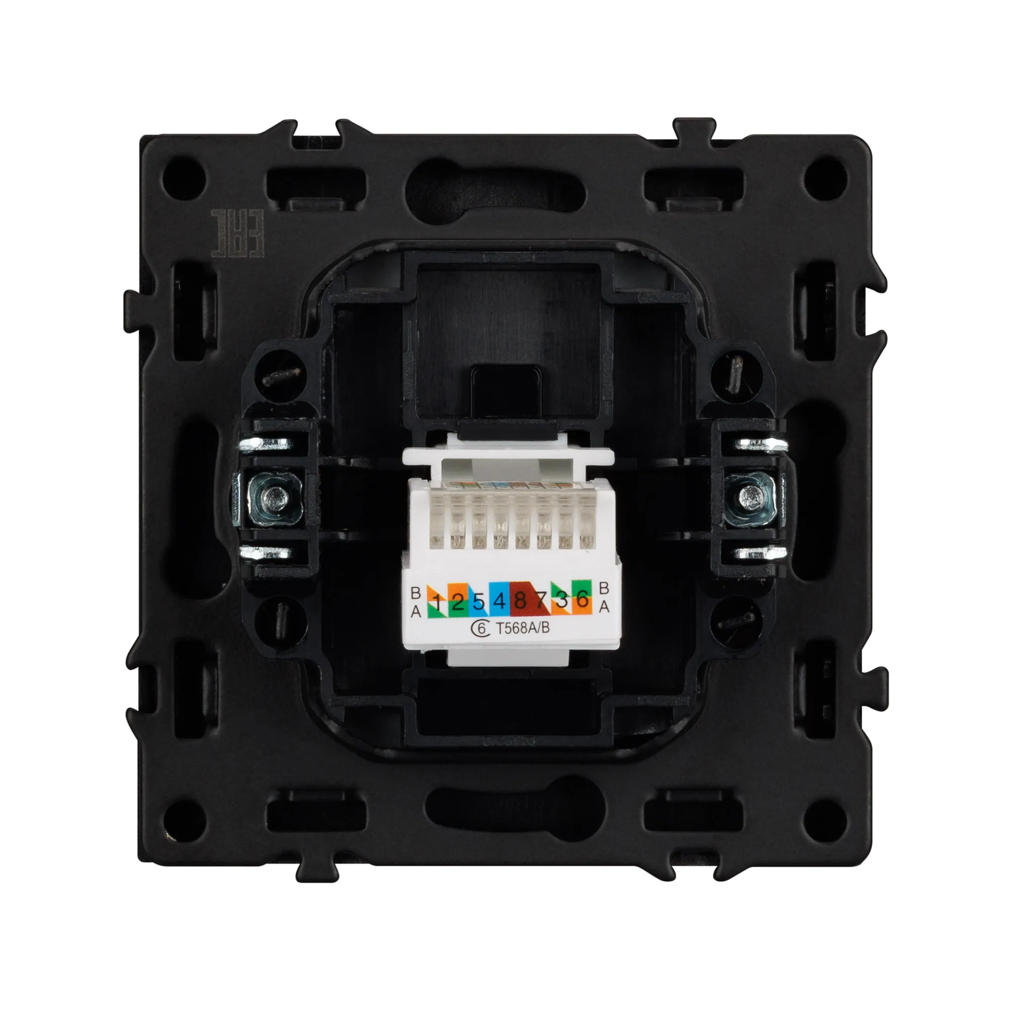 Механизм компьютерной розетки на 1 пост 6-й категории. Цвет - черный, с Soft-Touch покрытием. Без фронтальной рамки. Уровень пылевлагозащиты IP20. Тип подключаемого разъема - RJ45. Розетка устанавливается в стандартный подрозетник круглого сечения диаметром 60мм.